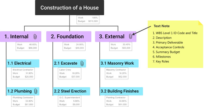Figure 3 shows the House Project Work Breakdown Structure expanded to Level 1, 2, and 3 Elements. The lowest Levels of each Leg and Branch of the WBS are called Work Packages. Work Packages cover information related to the deliverable, such as owner, milestones, durations, resources, risks, etc. This information is described in the WBS Dictionary.